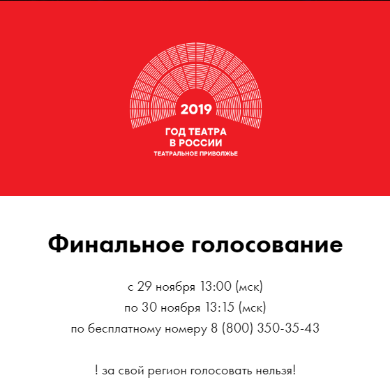 29 ноября в 13:00 стартует голосование за лучшую театральную постановку стартует и завершится 30 ноября в 13:00. Чтобы выбрать понравившийся школьный и студенческий спектакль, необходимо позвонить по бесплатному номеру 8-800-350-35-43. Каждому спектаклю присвоен свой порядковый номер (от 1 до 14 — у студенческих, от 15 до 28 — у школьных).